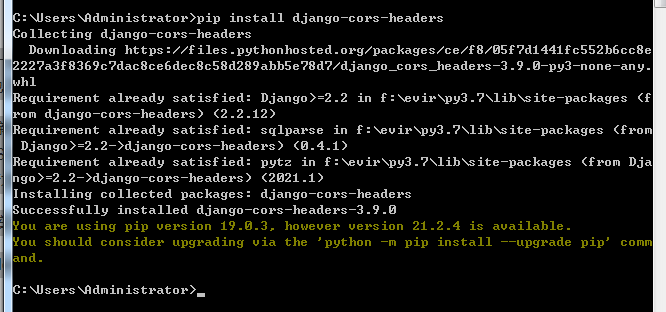 - 打开cmd,执行命令:pip install django-cors-headers