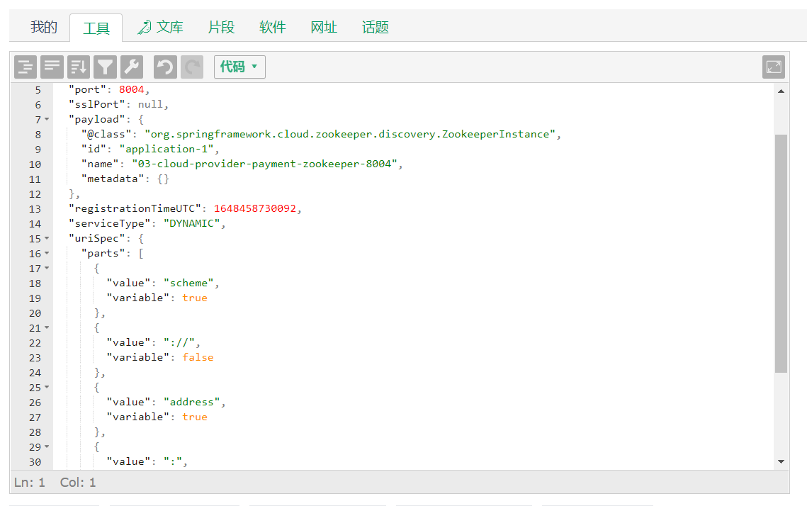 {"name":"03-cloud-provider-payment-zookeeper-8004","id":"4d4a95dd-81db-40bc-a953-287088b0057f","address":"localhost","port":8004,"sslPort":null,"payload":{"@class":"org.springframework.cloud.zookeeper.discovery.ZookeeperInstance","id":"application-1","name":"03-cloud-provider-payment-zookeeper-8004","metadata":{}},"registrationTimeUTC":1648458730092,"serviceType":"DYNAMIC","uriSpec":{"parts":[{"value":"scheme","variable":true},{"value":"://","variable":false},{"value":"address","variable":true},{"value":":","variable":false},{"value":"port","variable":true}]}}