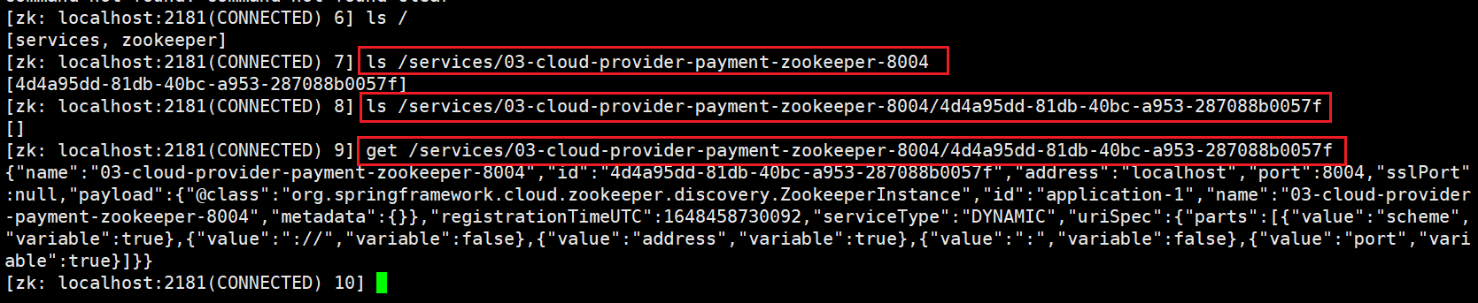 [zk: localhost:2181(CONNECTED) 8] ls /services/03-cloud-provider-payment-zookeeper-8004/4d4a95dd-81db-40bc-a953-287088b0057f