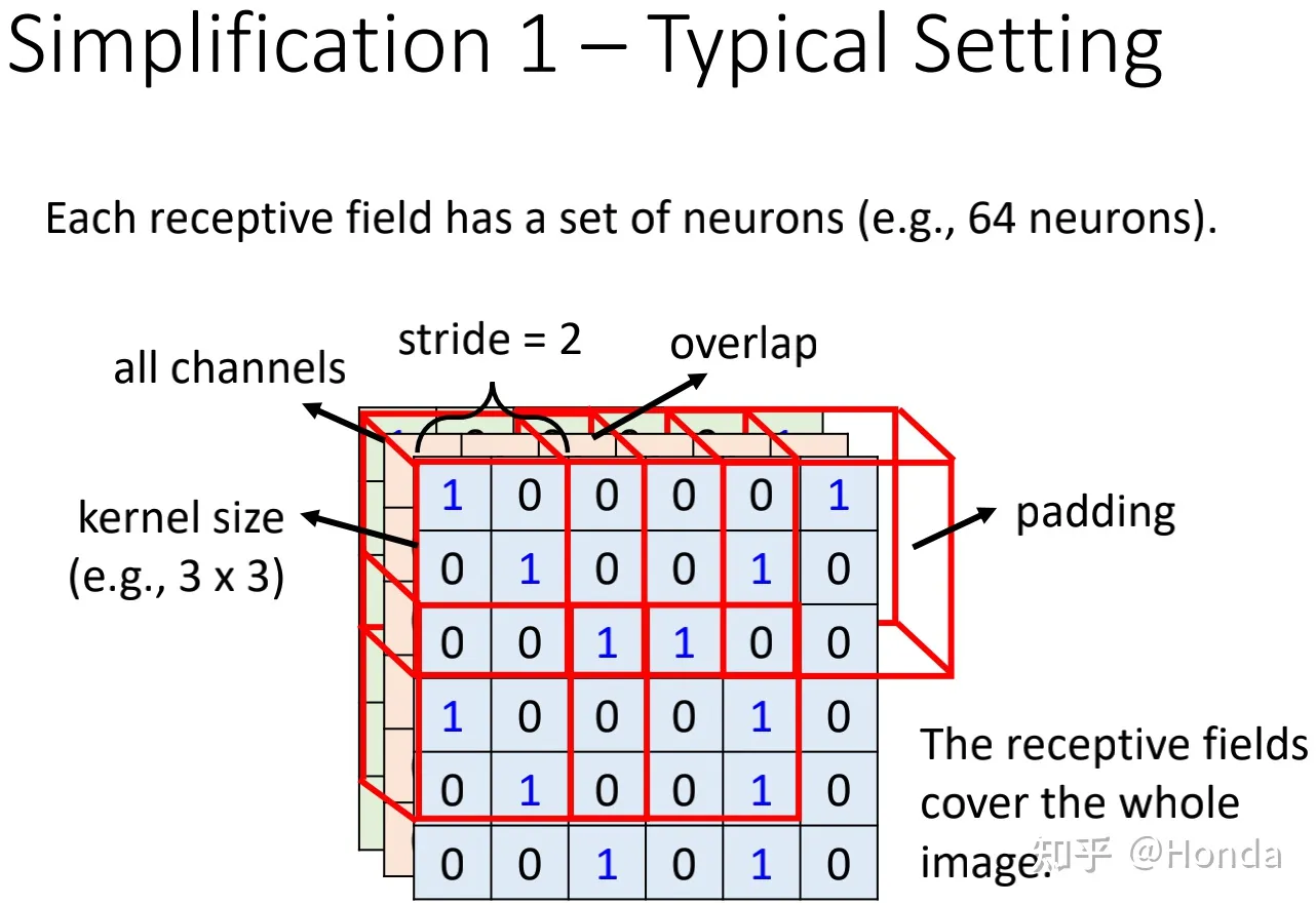 通常一个Receptive field(注意不是kernel size),可以被很多neural照顾到,比如64层隐层,那每一层都会有自己的kernel 去照顾到这个Receptive field