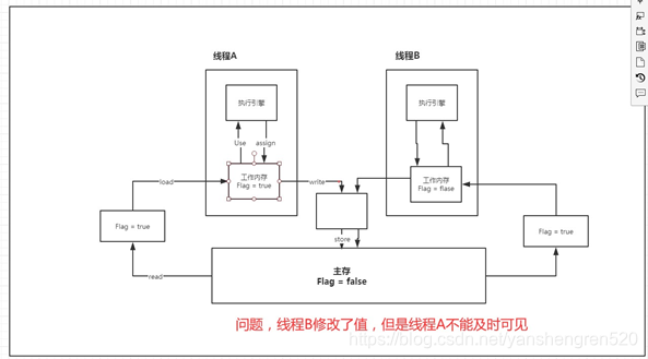 首先我们要了解JMM (Java内存模型),线程分为 工作内存 、主内存。 图中,有两个线程,每个线程都有属于自己的工作内存;我们首先在主存中有Flag变量,有一个线程A,从主存中读取值,把值加载工作内容中,这样工作内存中也有一个Flag变量。线程A修改值先修改工作内容,并把值再写入到主存中。这个流程叫内存交互。
