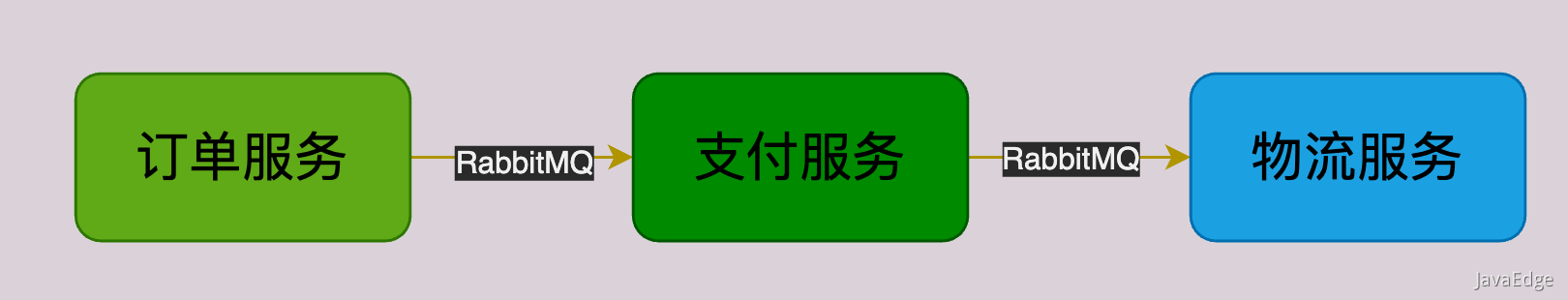 如下是一个简化后架构图,订单服务完成处理后,通过MQ把消息发给支付服务,支付处理后,再通过MQ把消息发给物流: