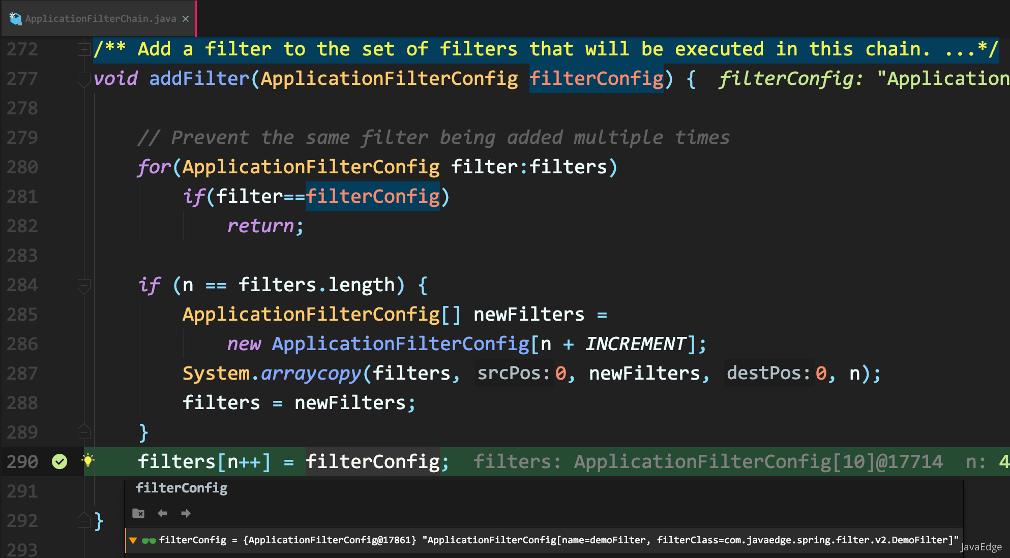 每个被初始化的 Filter 都会通过 filterChain.addFilter() ,加入Filters,并同时更新n,使其等于 Filters数组长度。