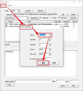 8. 打开【FS_Hi3861开发板光盘资料\工具软件\HarmonyOS相关工具\Hiburn】程序烧写软件,点击左上角“setting”中“com setting”选项,配置一下串口的波特率为2000000,然后点击确定,如下图所示: