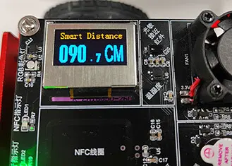 设备端烧写程序成功之后,按下“复位”按键之后,可以看到OLED显示屏上显示检测到的距离,如下图所示: