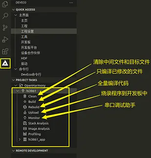 5. 在Vscode的左侧按钮中,打开DevEco Device Tool开发工具,在开发工具中首先点击“Clean”,再点击“build”进行编译源码。