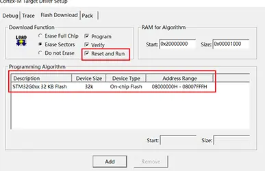 19. 然后点击“Settings”,再点击“Flash Download”,勾选“Reset and Run”,添加STM32G0系列 Flash烧写算法。