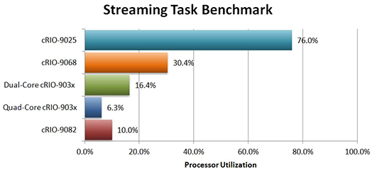 为了证明CompactRIO控制器的性能,编制了一系列控制和监测应用基准测试。这些测试同样适用于CompactRIO控制器(NI cRIO-903x)的所有双核和四核变体。