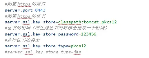 SpringBoot可以通过在application.properties或application.yml配置文件中配置各种server.ssl.*属性来声明性使用SSL(https),比如下面的例子在application.properties中设置SSL属性:
