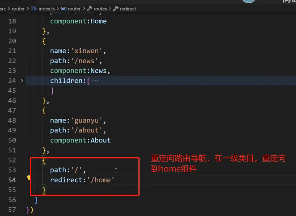 4.重定向路由导航redirect使用。可用于程序初始化页面显示的组件内容。