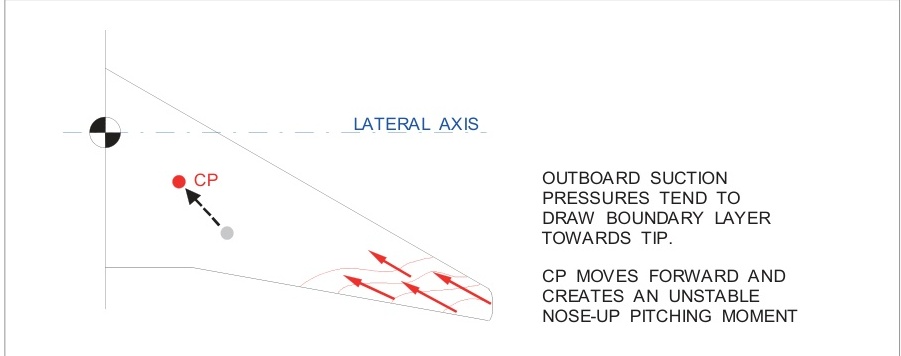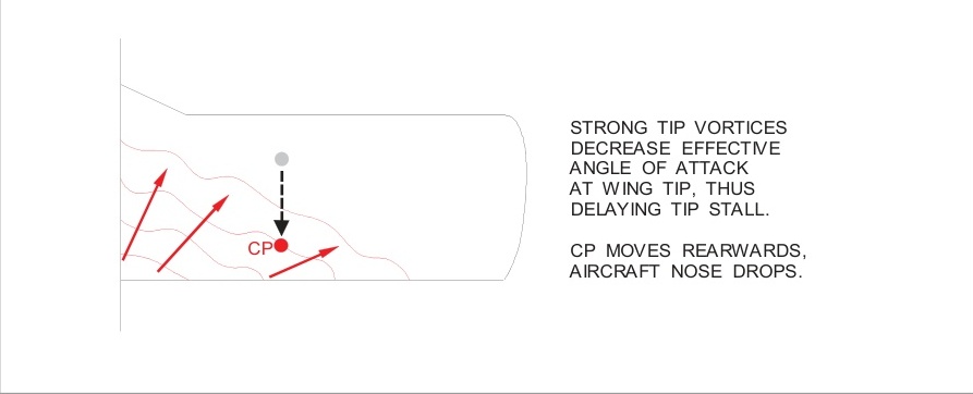 后掠翼平面形状的翼尖失速使飞机在失速时有上仰-俯仰的倾向。这是由于当机翼尖先失速时,压力中心向前移动所致。