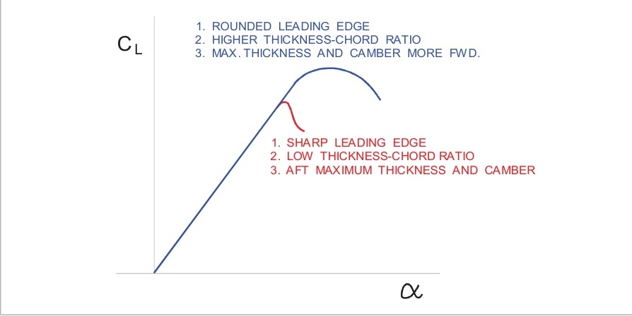具有大厚弦比的翼型将在较高攻角失速,且失速将更加平缓。