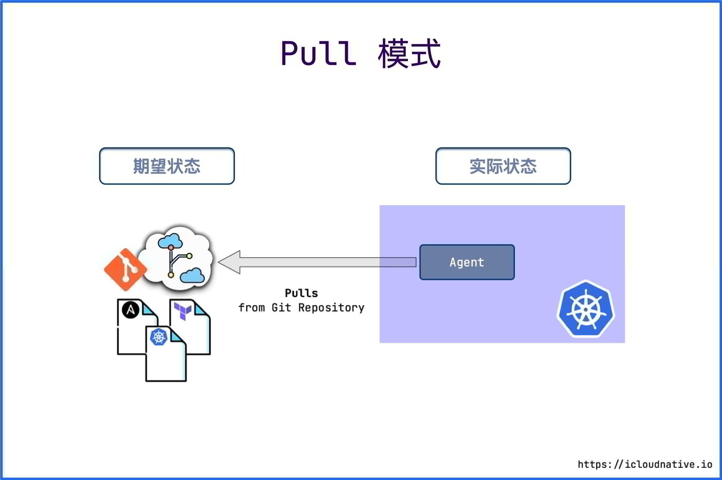 Pull 模式会在目标环境中安装一个 Agent,Agent 会周期性地监控目标环境的实际状态,并与 Git 仓库中的期望状态进行比较,如果实际状态不符合期望状态,Agent 就会更新基础设施的实际状态以匹配期望状态。