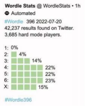 日期、比赛号码,一天的单词,报告分数的人数,玩家的数量,和猜到的比例在一次尝 试,两次尝试,三次尝试,四次尝试,五次,六次尝试,或无法解决谜题 (由X) 。例如 ,在图2中,2022年7月20日的单词是“陈腐的” ,结果是通过挖掘Twitter得到的。虽然 图2中的百分比总和为100%,但在某些情况下,由于四舍五入,这可能不是真的。