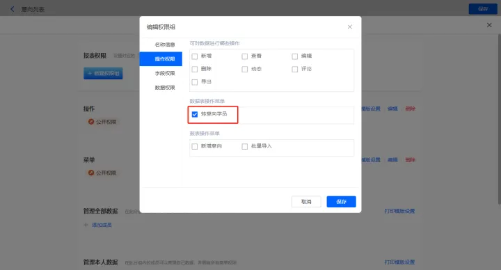 数据权限添加过滤条件,【转为意向学员】等于“0”;
