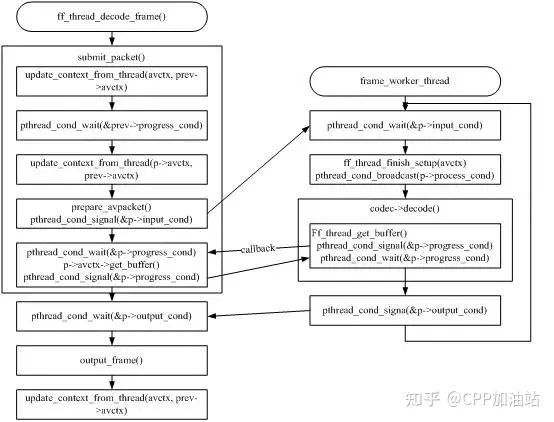 其中右侧的frame_worker_thread为解码线程,在open解码器时就已经创建,随后阻塞在pthread_cond_wait(&p->input_cond, &p->mutex)函数。等待被主线程唤醒。