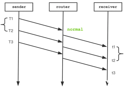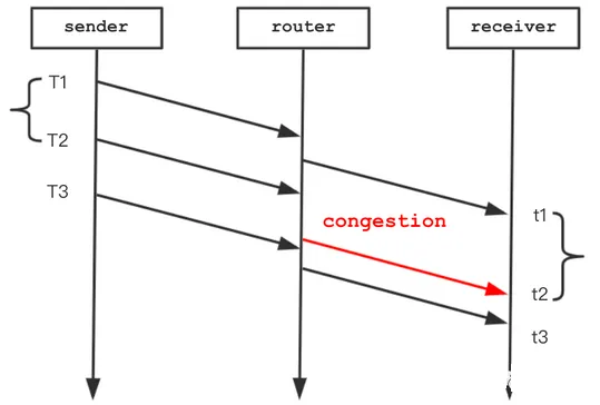 当网络存在拥塞,数据包经过 router 节点时经历排队等待,导致到达时间比原本要晚,延迟梯度:t2 - t1- (T2 - T1) > 0,如下图所示。