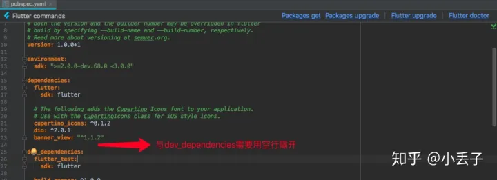 在Flutter工程中存在一个pubspec.yaml文件。此文件类似build.gradle,在这个文件中进行我们整个工程的一些配置,其中就包括了库的导入。配置完成之后,点击右上角的Packages get就能自动下载依赖。