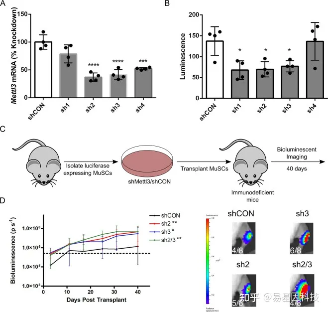 当在移植前将Mettl3敲低时,移植的MuSC植入和生物发光表达的可能性得到改善。