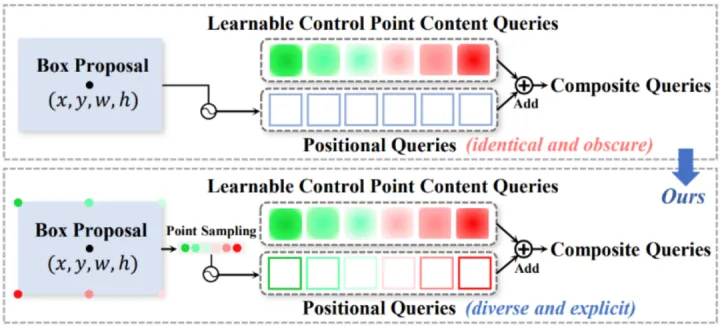 注:这里直接指明编码器通过ffn生成了粗粒度(coarse bounding boxes)的bbox,用bbox引导过解码器得到多点的文本控制点及文本,可以是边界点或贝塞尔曲线控制点。