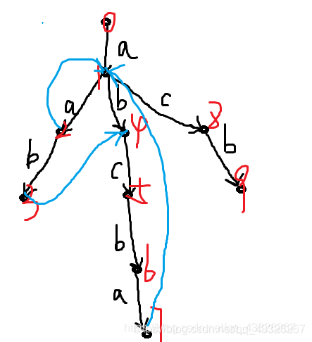 接着上文的例子,S失配没法跳c后回到根节点0,然后继续跳b,失配;跳a,跳到1,8,9;然后回到0……