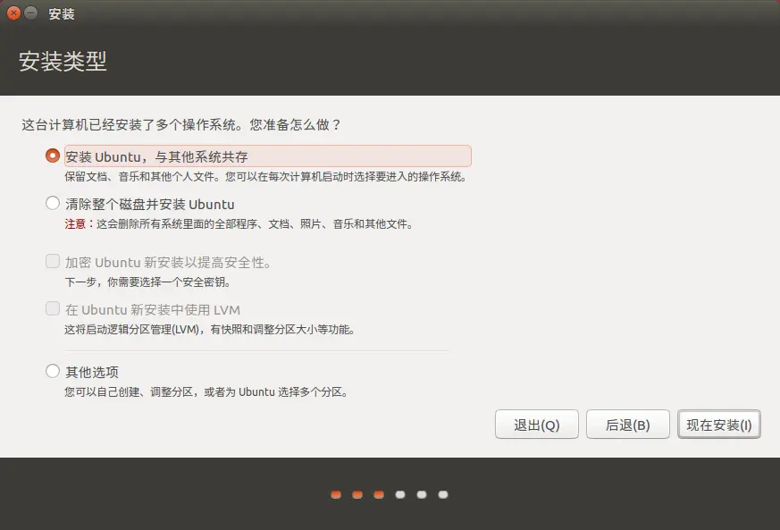如果第一项中没有‘ 与其它系统共存’这个明确提示,请务必选择最后一个‘其他选项’,然后手动分区。不然,硬盘就可能被格式化了,图示如下: