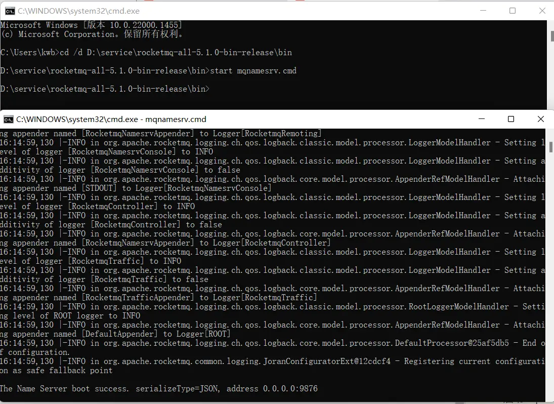 先打开cmd命令窗口,cd进入到RocketMQ解压的bin目录下,再执行启动命令。在Windows11下这里有一个坑,你会发现无论你怎么cd好像都没办法进入到你想要的目录下,cd命令无效。以下我将提供两种cd到目录的方式: