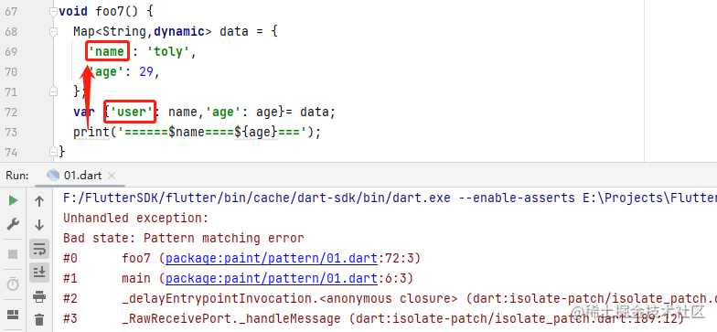dart void foo1() { var user = ('toly',29); var (name, age) = user; // 直接解构对象 print('======$name====${age}==='); }