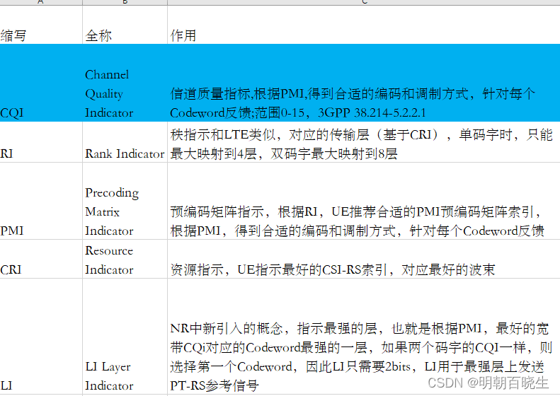 1 CQI :CQI-Channel Quality Indication,信道质量指示,CQI由UE测量所得,因此,CQI一般指的是下行信道质量。eNodeB根据CQI信息选择合适的调度算法和下行数据块大小,以保证UE在不同的无线环境下获取最佳的下行性能。