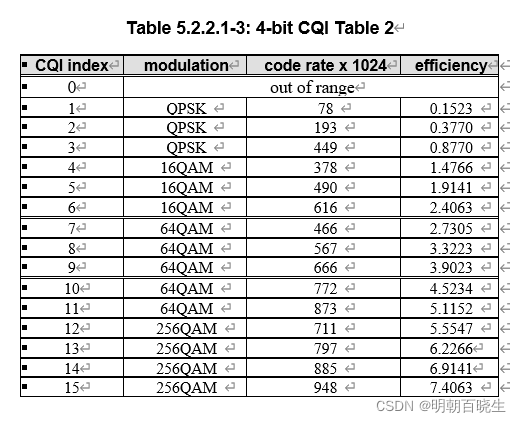 CQI 跟 modulation 以及 code rate 有对应的映射关系