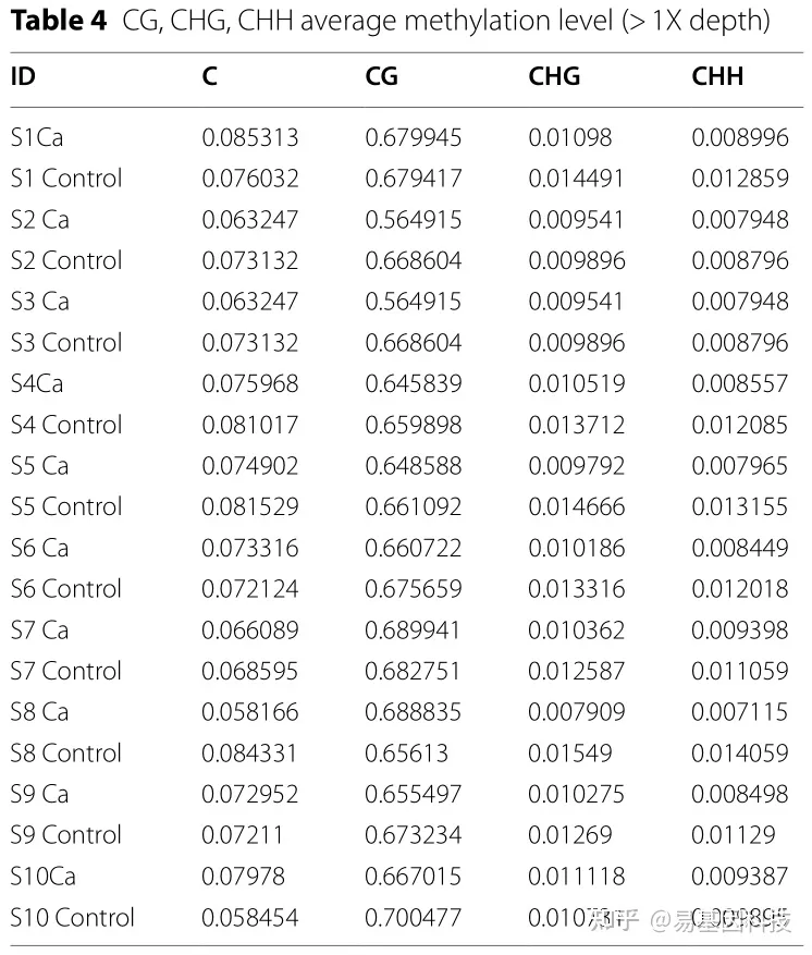 表4:CG、CHG、CHH平均甲基化水平(>1X深度)