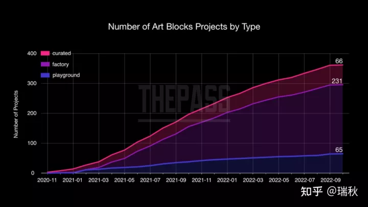 Art Blocks 早前根据三种不同的类型进行分类,分别为Curated、Playground和Factory,随着业务的增长,后又增加Exploration和Art Block X Pace合作系列。