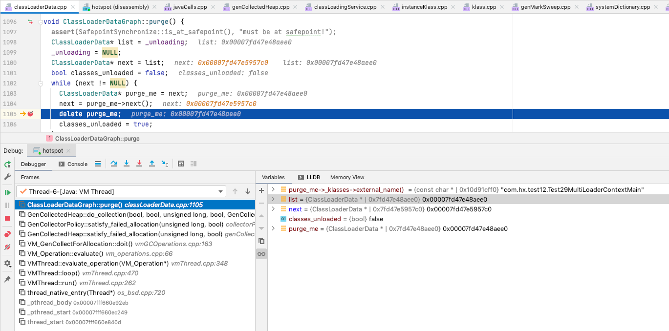 堆栈信息提上来一点, 看到这里有一个 data->is_alive(is_alive_closure) 的判断, 判断的就是 对应的 classloader 是否被 gc 标记(还存活)