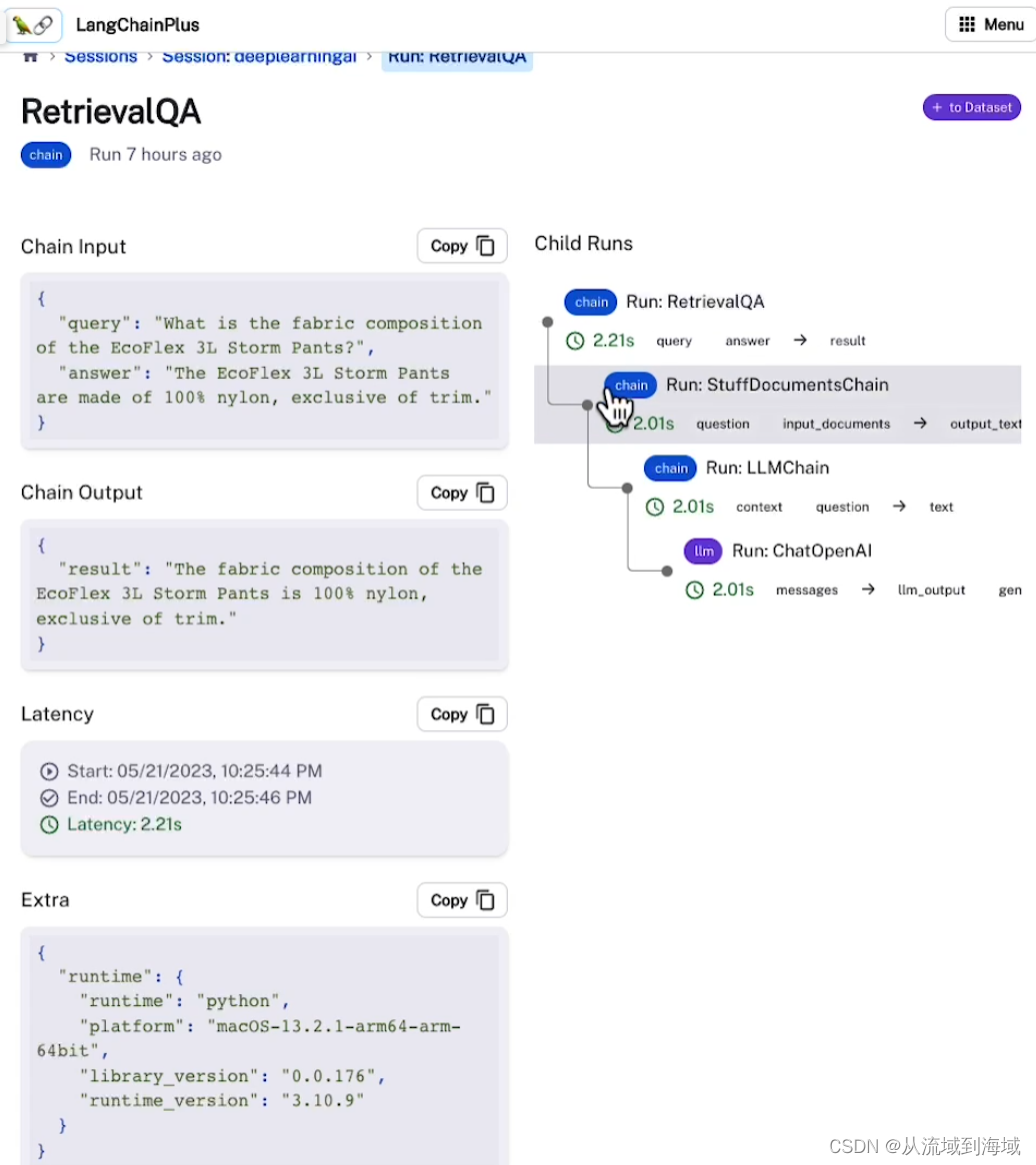 可以点击可视化查看调用链,也可以点击节点查看当前节点chain的详细信息,包含输入、输出、时延、额外新信息(运行环境)等,如下图: