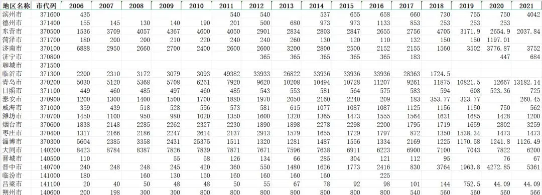 我们先来看一下Excel格式的数据,地级市和县级市的2006—2021年节约用水量汇总为一个Excel文件,我们来预览一下: