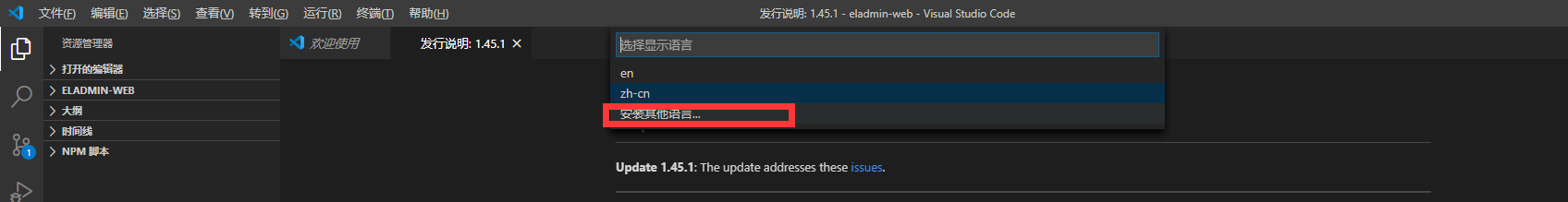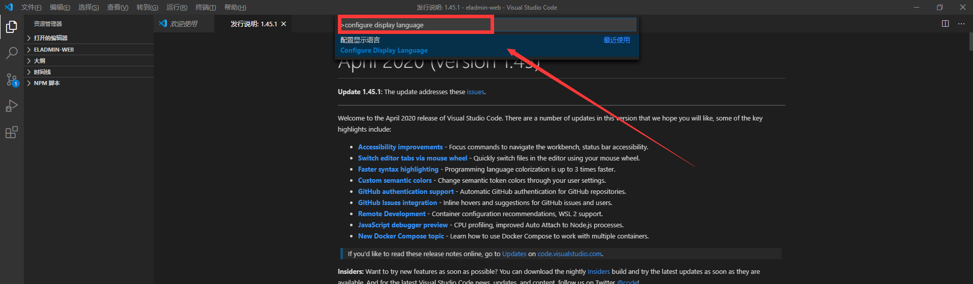 Ctrl+Shift+P 输入 "configure display language" 然后点击确定后,修改locale.json文件下的属性"locale"为"zh-CN". 重启VSCode工具