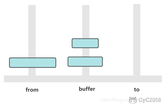 有三个柱子,分别为 from、buffer、to。需要将 from 上的圆盘全部移动到 to 上,并且要保证小圆盘始终在大圆盘上。