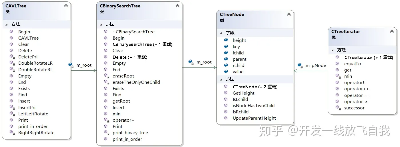 AVLTree内部直接创建了一个BinarySearchTree,只是多了对BinarySearchTree的再平衡操作;平衡的动作就是AVLTree的成员函数;两种Tree公用TreeNode类型,其中TreeNode的height成员只有AVLTree会使用;两种Tree公用TreeIterator;