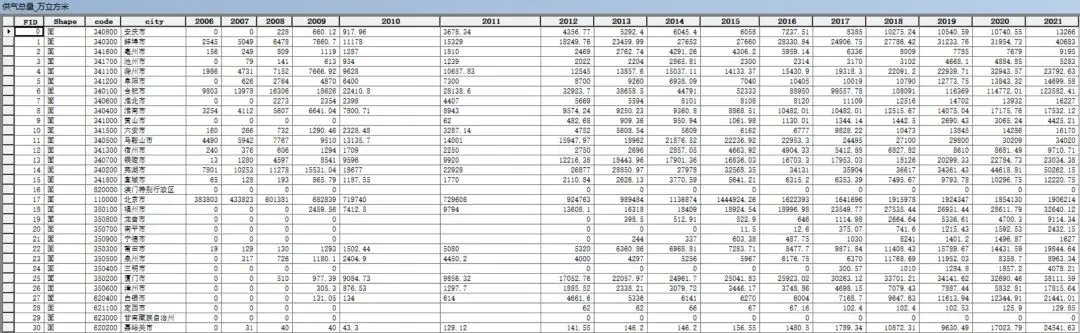 我们先来看一下Excel格式的数据,地级市和县级市的2006—2021年天然气供气总量汇总为一个Excel文件,我们来预览一下: