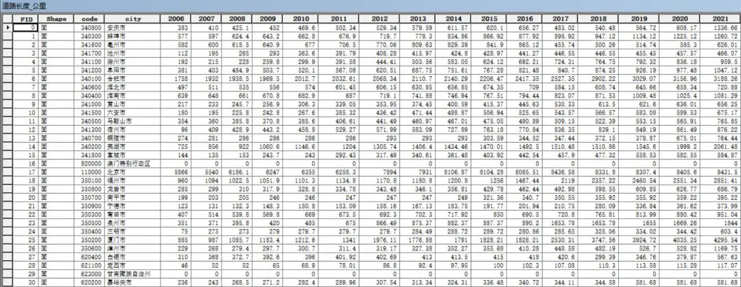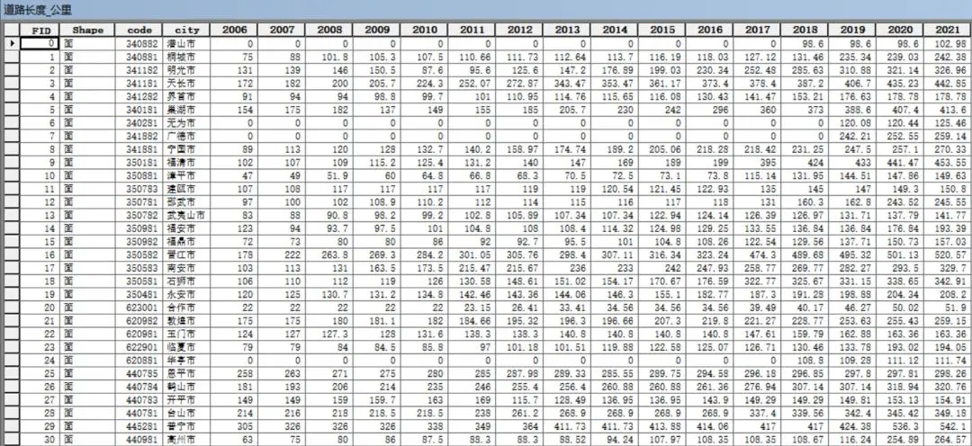 我们先来看一下Excel格式的数据,地级市和县级市的2006—2021年道路长度汇总为一个Excel文件,我们来预览一下: