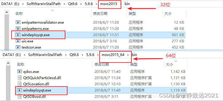 使用 windeployqt 命令打包时注意区分 32 位和 64 位(二者区别当然很大),对应上你的 exe 程序位数(不然会提示很多运行时库的问题),下图是我的 Qt 安装目录展示: