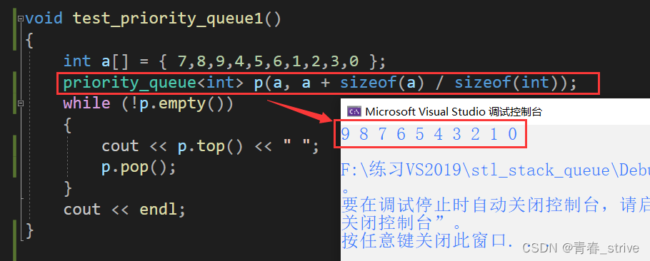 通过输出结果可以明白,优先级队列是默认大堆,因为每次取堆顶的数据,然后pop,取出来是最大的