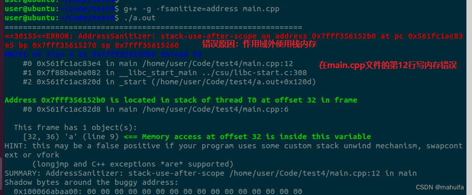 -fsanitize=address:使用 AddressSanitizer(ASan)C/C++的内存错误检测器,它可以检测内存访问错误,如堆栈缓冲区溢出、堆区越界等;编译指令:g++ -g -fsanitize=address main.cpp;- GCC版本:4.8+