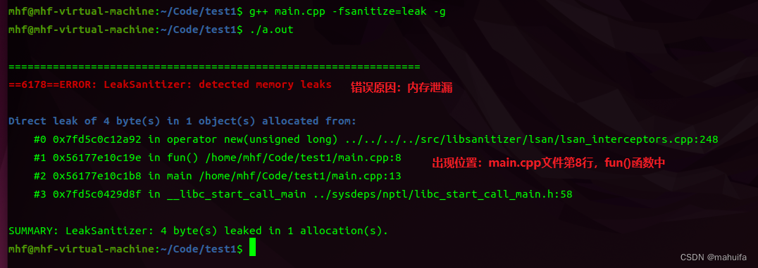 -fsanitize=leak:使用 LeakSanitizer(LSan)工具,它可以检测程序中的内存泄漏。#include <iostream> using namespace std; void fun() { int* a = new int(); } int main() { fun(); return 0; }