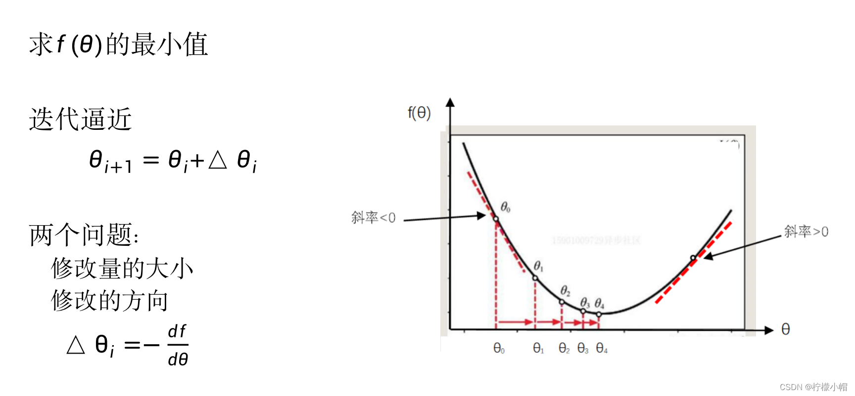 左边的导数值是负的,这时 θ \theta θ 值应该加大,右边的导数值是正的,这时 θ \theta θ 值应该减小,这样才能使得θ值向中间靠近,逐步接近 f ( θ ) f(\theta) f(θ)取值最小的地方。所以, θ \theta θ 的修改方向刚好与导数值的正负号相反。因此,我们可以这样修改 θ i \theta_i θi 值:
