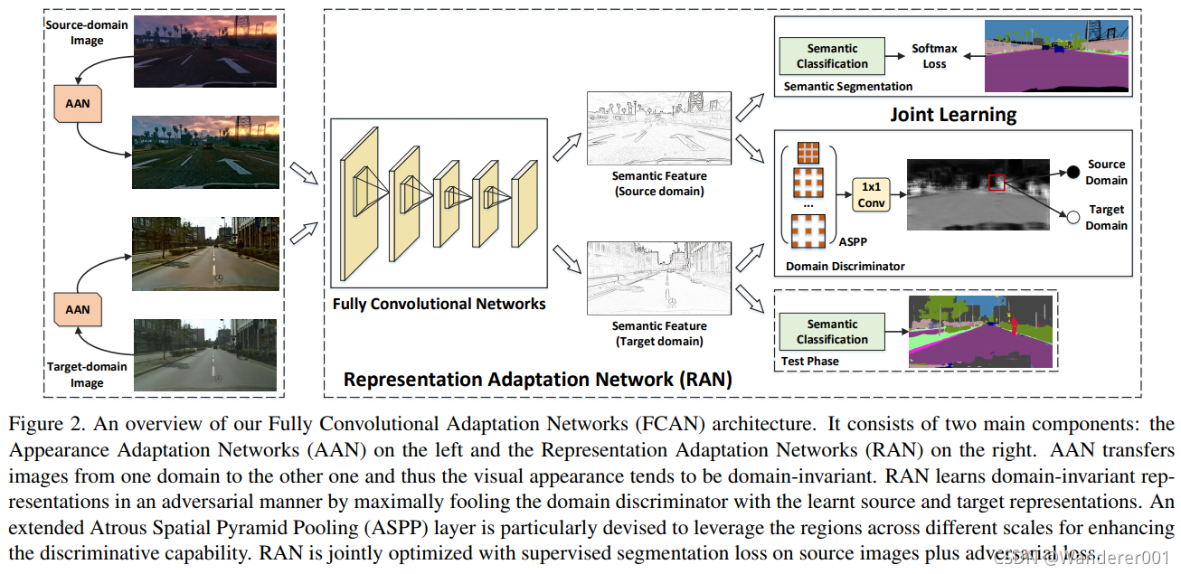 通过将外观级和表示级不变性的思想整合到无监督域自适应中以增强语义分割,我们提出了一种全新的全卷积自适应网络(FCAN)架构,如图2所示。整个框架由外观适应网络(Appearance Adaptation network, AAN)和表示适应网络(Representation Adaptation network, RAN)组成。理想情况下,AAN是构建一个图像,该图像捕获源图像中的高级内容和目标域的低级像素信息。AAN从白噪声图像开始,通过梯度下降调整输出图像,使输出图像的特征映射与源图像或目标域图像的均值特征映射之间的欧氏距离最小。在RAN中,首先使用共享的全卷积网络(FCN)生成每个域的图像表示,然后通过双线性插值对输出进行上采样,用于像素级分类,同时使用域鉴别器区分源和目标域。为了扩大特征图中滤波器的视场,赋予域鉴别器更大的能力,设计了一种空间金字塔池(ASPP)策略。RAN通过优化两个损失来训练,即分类损失来度量像素级语义,对抗损失来最大限度地愚弄域鉴别器,利用学到的源和目标表示。通过外观层和表示层的适应性,我们的FCAN可以更好地构建跨域不变性,从而获得图1 (b)中令人鼓舞的分割结果。
