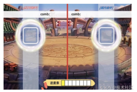 在Drum Master(击鼓大师)模式下,音符块会跟随音乐的节奏信息出现,玩家需要等待音符块到达目标点后进行击打,不同的音符块需要执行不同的击打动作(即左手击打与右手击打)。这个游戏我们是仿照太鼓达人这个游戏来复现的,我们设计的游戏画面如下图所示。游戏中,音符块会从右边出现,音符块有两种类型,分别对应需要用左手敲还是右手敲。此外游戏画面中还有歌曲的进度条、游戏的得分、游戏的连击得分信息。