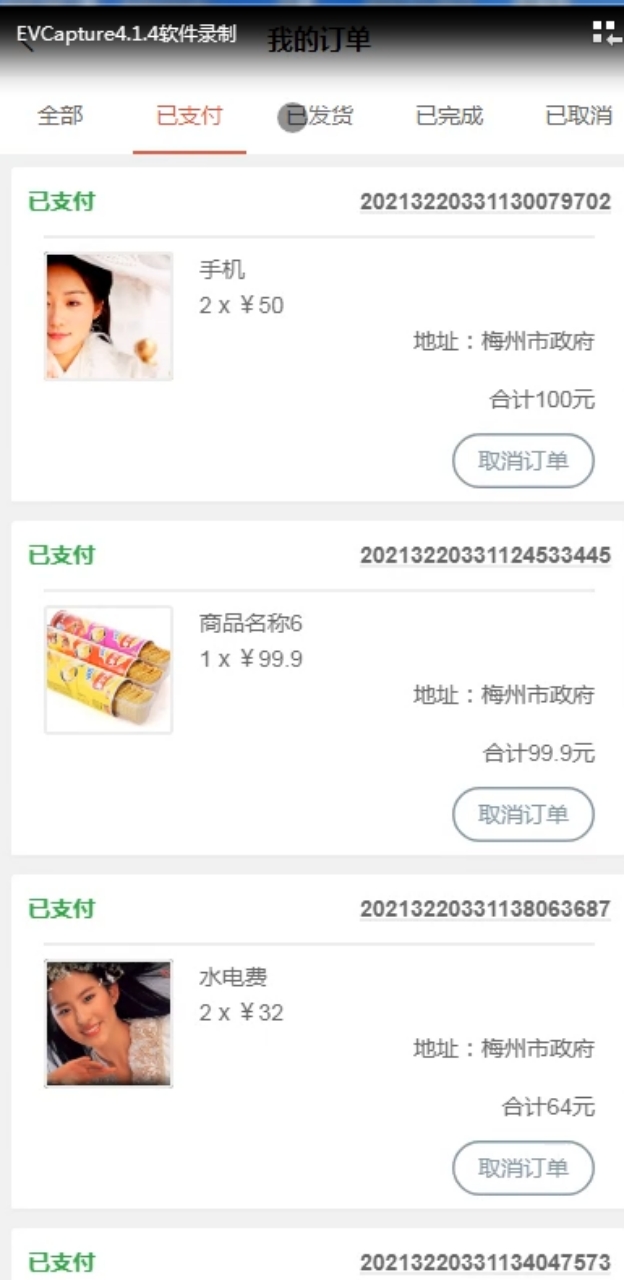 我的订单:通过页面可以获取已支付、已发货、已完成、已取消等订单信息,进行查看或取消订单操作。如图5-17所示。