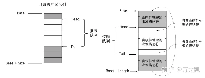 网卡DMA控制器通过环形队列与CPU交互,环形队列由一组控制寄存器和一块物理上连续的缓存构成。主要的控制寄存器有Base, Size, Head和Tail。通过设置Base寄存器,可以将分配的一段物理连续的内存地址作为环形队列的起始地址,通告给DMA控制器。同样通过Size寄存器,可以通告内存快的大小。Head寄存器往往对软件只读,它表示硬件当前访问的描述符单元。而Tail寄存器则由软件来填写更新,通知DMA控制器当前已准备好被硬件访问的描述符单元。这一段话来自《深入浅出DPDK》的描述。