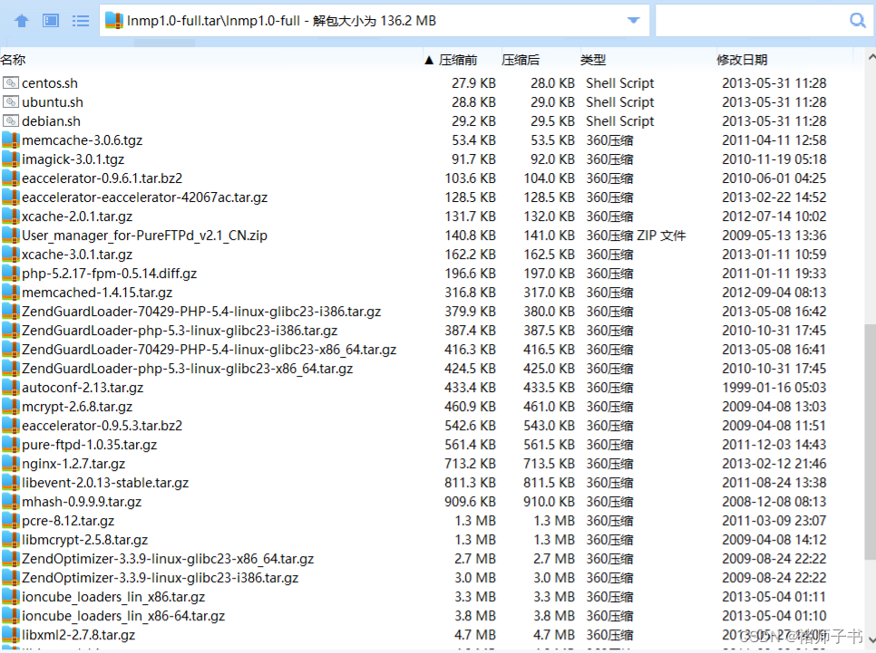 不同版本的lnmp包含的安装包不同。但都包含了 Nginx+MySQL+PHP 基础环境,而且一键安装的也主要是这3个软件,其他的都是扩展软件包,在安装好这基础环境的情况下,再安装扩展包,安装扩展包时只需进入这解压包中,执行相应的安装脚本即可。